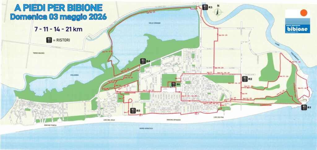 Lauf “ZU Fuß DURCH BIBIONE“. Die Strecke hat verschiedene Längen, 7 km (dieser Lauf ist auch für Alle geeignet), – 11 – 14 und 21 km.